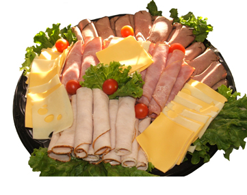 | Sliced Pit Cooked Ham, Smoked Turkey Breast, Roast Beef, Swiss Cheese, Yellow and White American Cheese. Rolls, Mayo, Ketchup and Mustard are included to make your own sandwiches |